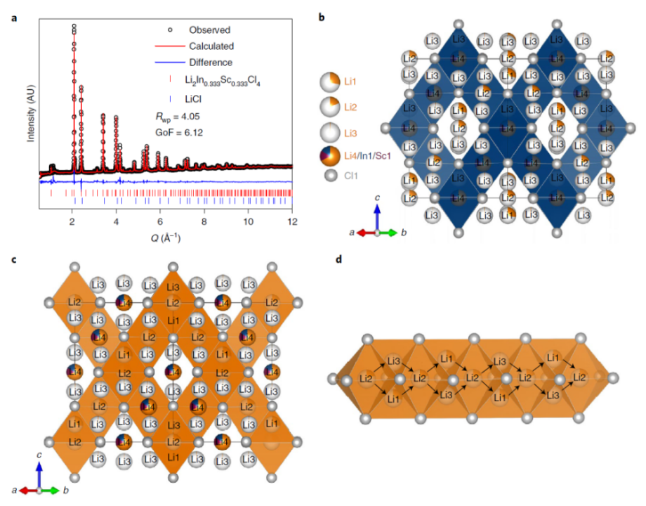 Li2In1-3Sc1-3Cl4的結構和可能的鋰離子擴散途徑