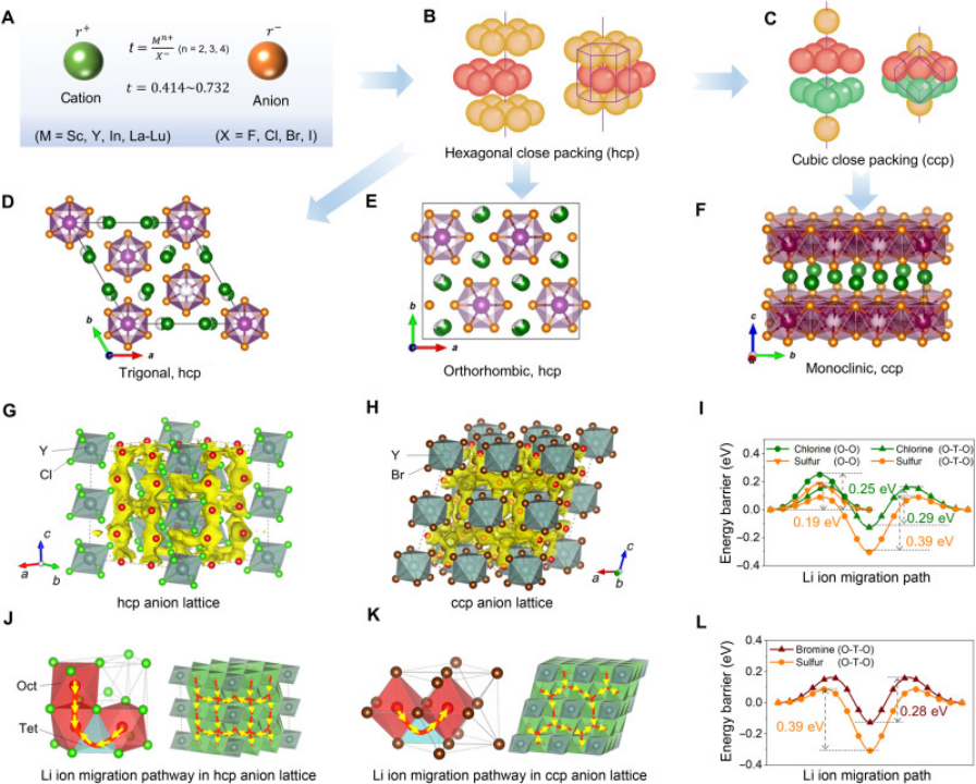 (A)正負離子晶體半徑比;(B)鹵素離子的六方密排結構;(C)鹵素離子的立方密排結構;(D)含hcp陰離子排列的三角晶體結構(Pm1);(E)含hcp陰離子排列的正交晶體結構(Pnma);(F)含ccp陰離子排列的單斜晶體結構(C2/m);(G)Li3YCl6(類似hcp的陰離子晶格)和(H)Li3YBr6(類似cp的陰離子晶格)的晶體結構。黃色標記為AIMD模擬得到的Li+概率密度;(I)在hcp亞晶格中單個Li+遷移的能量分布圖;(J)Li3YCl6中Li+的遷移路徑;(K)Li3YBr6中Li+的遷移路徑;(L)ccp亞晶格中單個Li+遷移的能量分布圖。