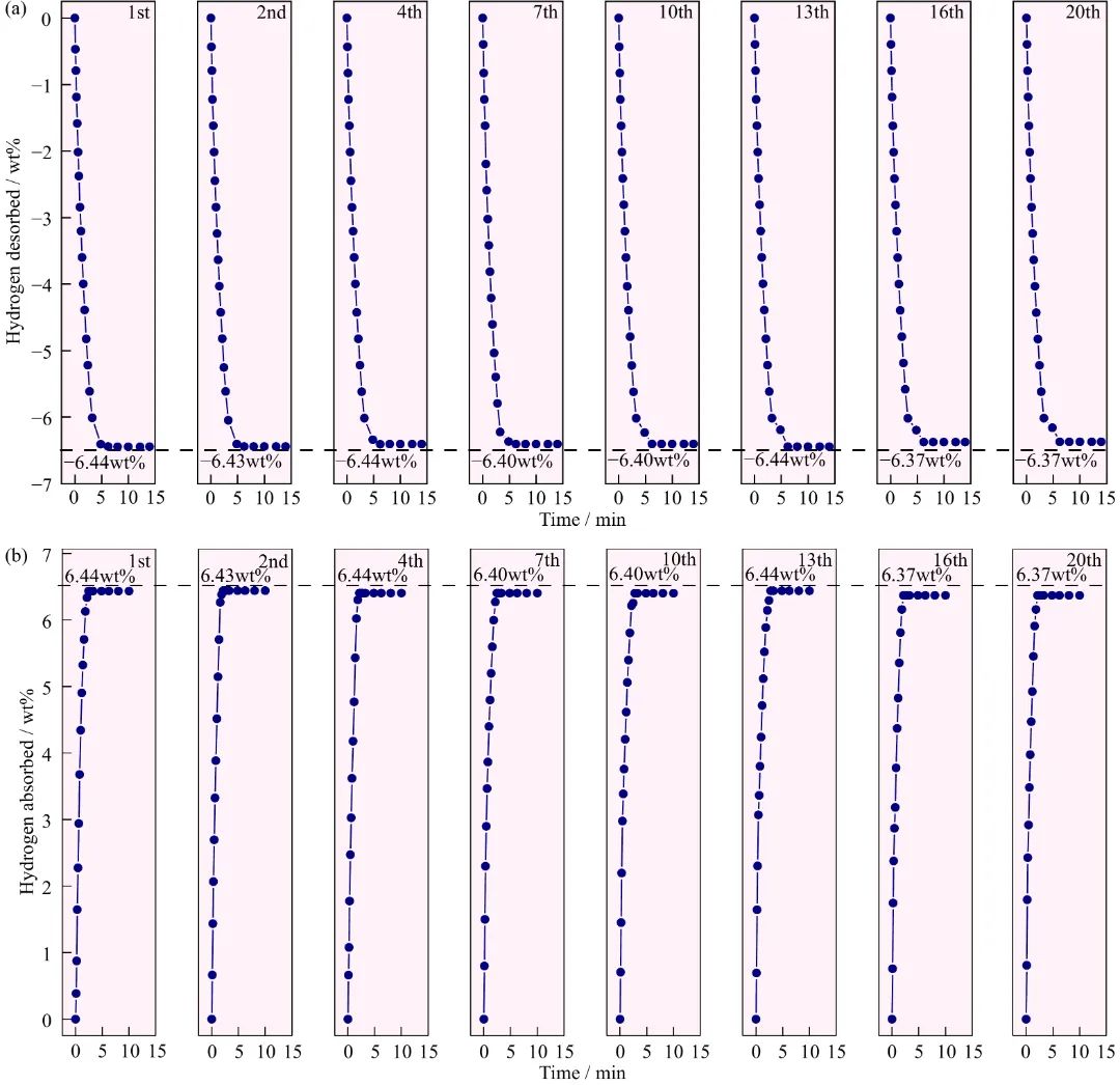 經(jīng)20次循環(huán)后,MOFs-V樣品摻雜的MgH2體系具有良好的儲(chǔ)氫容量保持率。